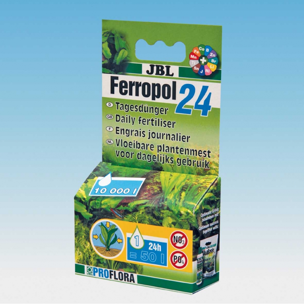 JBL Ferropol 24 este hrana zilnica pentru o dezvoltare luxurianta a plantelor din acvariul dvs. Multe din oligoelementele esentiale nu pot fi adaugate ca si ingrasaminte pe termen lung, pentru ca sunt instabile, iar in combinatie cu alte substante, se descompun. Cu toate acestea, din moment ce plantele se pot dezvolta la capacitate maxima doar daca au la dispozitie toate substantele nutritive, JBL a conceput un ingrasamant special ce contine toate oligoelementele delicate, cat si alte substante vitale, intr-o forma adaptata. JBL Ferropol 24 administrat zilnic, ajuta la cresterea bogata si armonioasa a plantelor din acvariu, previne deficientele de substante nutritive si este forma perfecta pentru ingrijirea plantelor. Pentru obinerea rezultatelor optime, se recomanda utilizarea JBL Ferropol 24 impreuna cu JBL Ferropol (atunci cand schimbati apa) si JBL AquaBasis plus. De asemenea se recomanda in plus si CO2. JBL Ferropol 24 nu contine fosfati sau nitrati. Dozare: O picatura de JBL Ferropol 24 pentru 50l apa in fiecare zi, dupa ce iluminarea a fost pornita. Se recomanda doua picaturi la 50l de apa, in cazuri speciale, cum ar fi plantele cu o cresterea rapida, iluminat puternic, plante rosii, filtrare puternica, cat si pentru aplicatii CO2. Flacoane: 10ml (pentru 10.000l apa) / 50ml (pentru 50.000l apa).