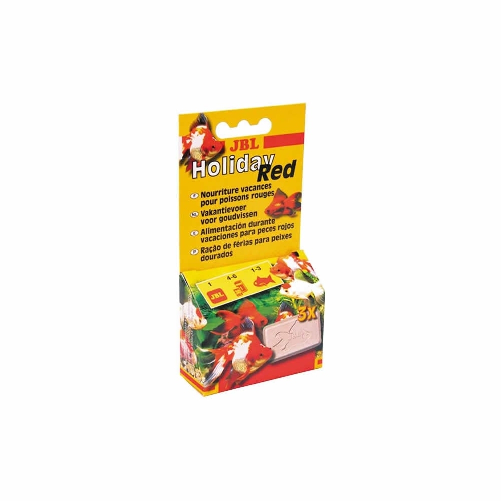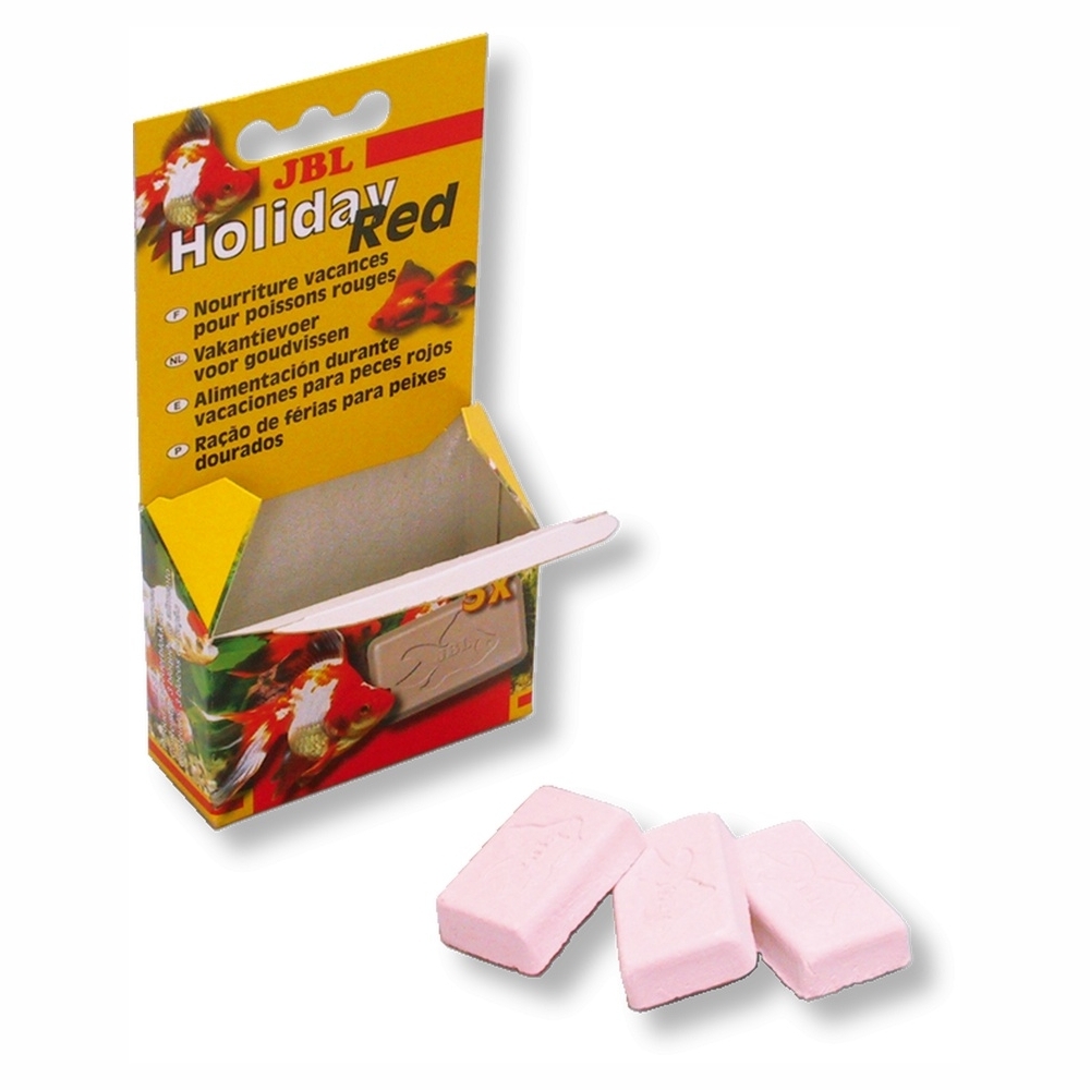 Hrană Holiday pentru peÅŸti aurii HolidayRed asigură automat hrana peÅŸtilor aurii în timp ce proprietarii sunt plecaÅ£i. ConÅ£ine toate ingredientele de care această specie are nevoie pentru o dietă echilibrată combinată într-o substanţă de bază neutră. Utilizare: • 1 cub de HolidayRed asigură automat doza de hrană pentru 1 - 3 peÅŸti aurii de mărime medie (aprox. 8 – 12 cm lungime) pentru 4 – 6 zile. IntroduceÅ£i unul sau mai multe cuburi în apă în funcÅ£ie de numărul peÅŸtilor. Cuburile se dizolvă încet, eliberând hrana. Recomandăm utilizarea unui singur cub pentru acvariile mici (cu dimensiuni sub 30 l) sau pentru bolurile de peÅŸti aurii, chiar dacă ele conÅ£in mai mult de trei peÅŸti. • După întoarcerea din vacanţă recomandăm proprietarilor schimbarea a 30 – 50 % din cantitatea de apă.