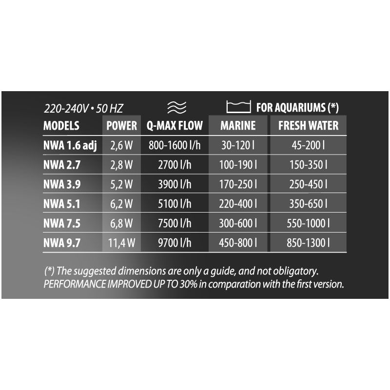 Newa Wave sunt prevazute cu ventuze de prindere puternice, pe baza de click si vacuum (fara magneti in afara acvariului) si au un sistem eficient anti-zgomot si anti-vibratie. Silentioase, cu un consum redus de energie, performante de top, flux total variabil, fara parti in afara acvariului si un system de ghidaj al cablului de alimentare pentru a evita cabluri inutile in acvariu, sunt doar cateva din dotarile acestor pompe.